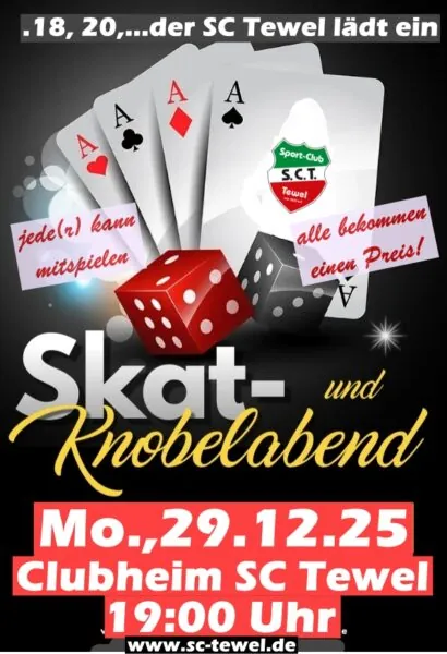 Der traditionelle Skat- und Knobelabend des Sport-Club Tewel diesmal auch wieder ‘zwischen den Jahren’ gespielt, und zwar am Montag, 29.Dezember ab 19…