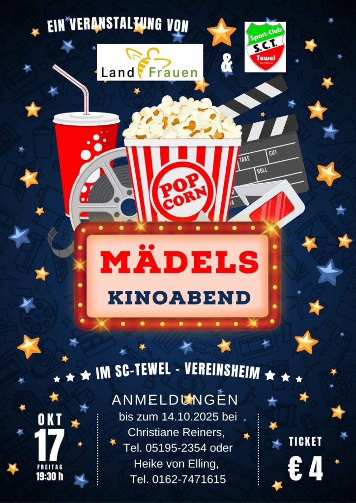 Am 8. Oktober 2025Am Fr., 17.10.2025 ab 19:30 Uhr veranstalten die Landfrauen gemeinsam mit dem SC Tewel einen Kinoabend für Frauen im Teweler Vereinsheim.