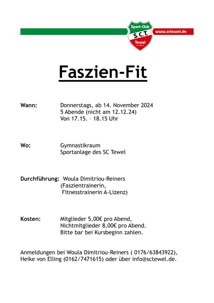Am 18. Oktober 2025Ab dem 14. November startet ein neuer Faszienfit-Kurs im Gymnastikraum des Sportplatzes Tewel. An fünf Abenden leitet die Faszientrainerin mit A-Lizenz Woula Dimitrou-Reiners vielfältige Übungen an.